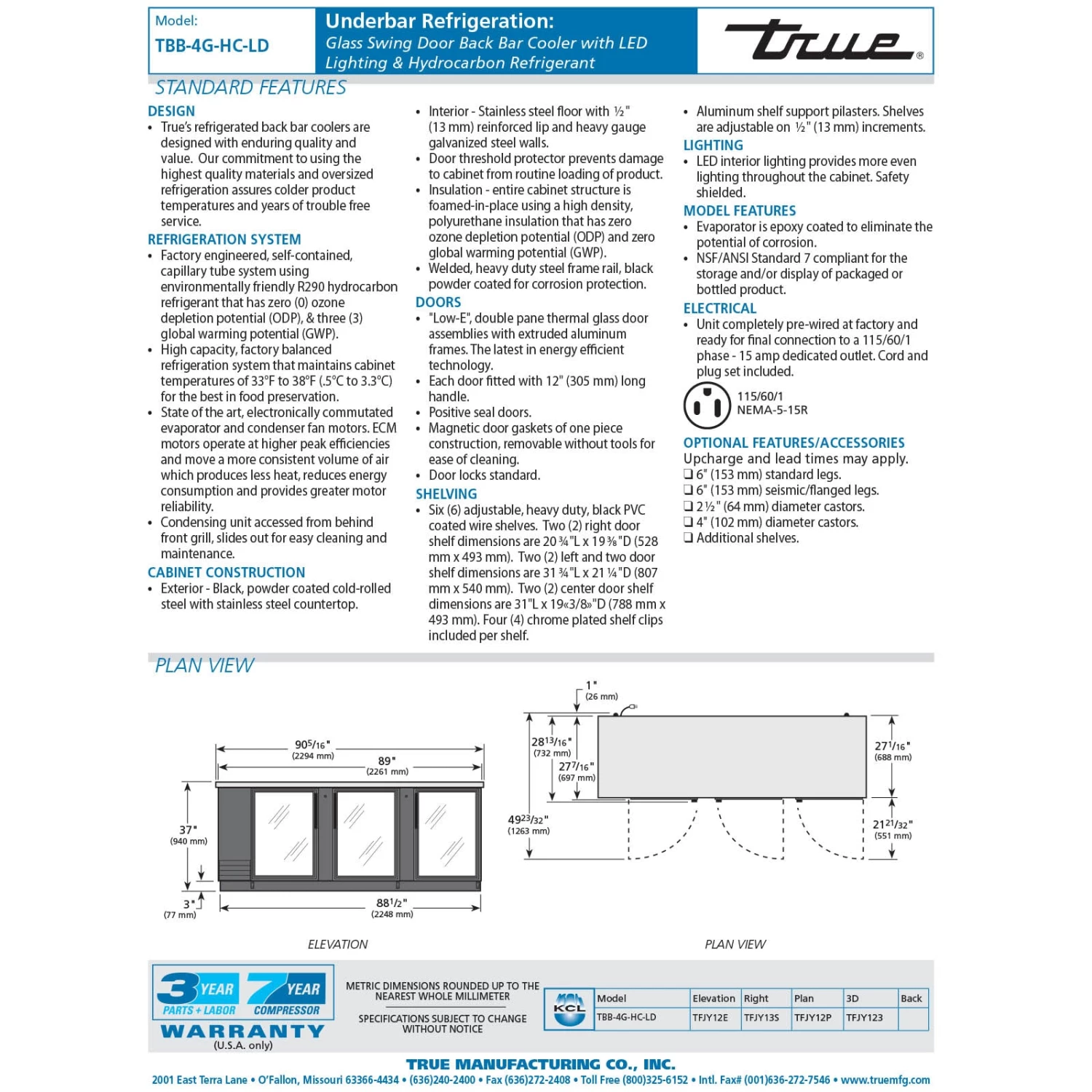 True’s three section bar refrigerator designed with enduring quality and value. Has 6 adjustable shelves which can hold 4 half-barrel kegs or 152 six-packs of 12 oz. cans.