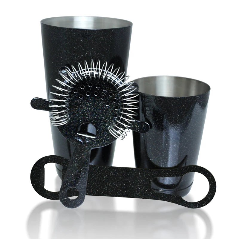 We add a little twilight sparkle to these bar tools for a bit more fun. You gotta see these colorful bar tending tools shine in your hands! This 4 Piece Black Twilight Package with V-Rod® is great for both girls and girls. Each set comes with a V-Rod® Opener, a 28 ounce and 16 ounce Weighted Shaker, and a 4 prong strainer.
