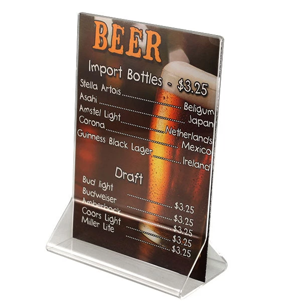 This clear, two-sided Acrylic Tabletop Menu Card Holder is the perfect addition to your bar, hostess desk, or dining room for displaying drink menus, happy hour deals, signature appetizers and more. It’s made of one continuous piece of heavy-duty acrylic, and the top and sides open easily for sliding in content. This menu card holder is easy to maintain with an occasional damp cloth to remove dirt and debris.