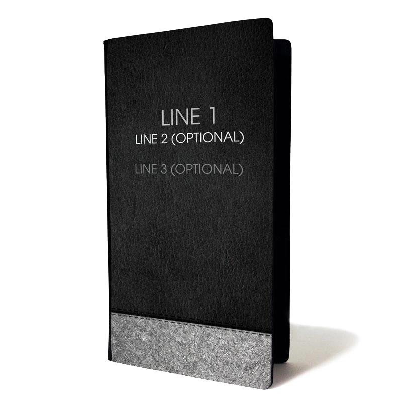These check holders are constructed from a high quality leather and polyester material combo on the outside, with a soft velvet lining on the interior. The face of the folder showcases a full color black leather and stone inspired design perfect for any type of service. The inside features 2 slots to hold checks, cash and receipts securely while the plastic slot is perfect for holding credit cards. Measures: 5.75″ x 10″.