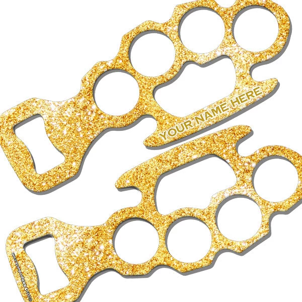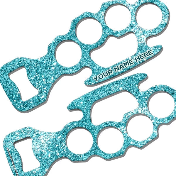 This opener may be styled after a weapon, but we have “blinged” it up for the ladies! Add your name or the text of your choice to any of these fun color “glitter” backgrounds, and open up beer bottles in style. This bottle opener makes a great gift idea for home or professional bartenders, and is one bad ass bar key! Claim your own today!