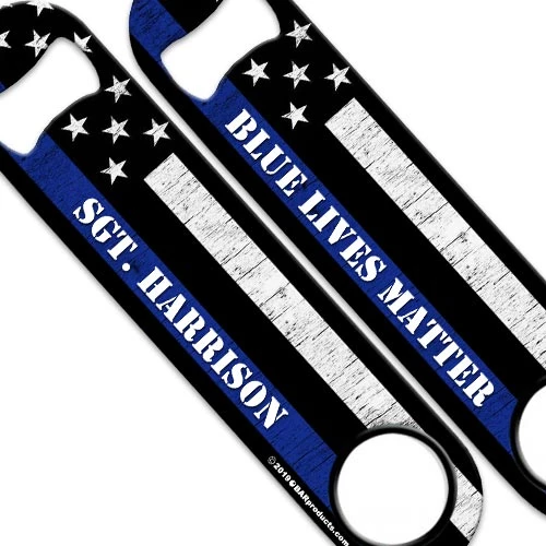 Support the brave servicemen and servicewomen in your life who put their lives on the thin blue line. Or show others you support the police yourself! You can customize this cool grunge blue lives matter flag bottle opener on one side or both. Simply type in the text and we do the rest! Add your name, business or anything you wish for a completely personalized bar key. Our printed bottle openers showcase vibrant color imprints wrapping a high quality stainless steel professional bottle opener. These bottle openers also make for great gift ideas.