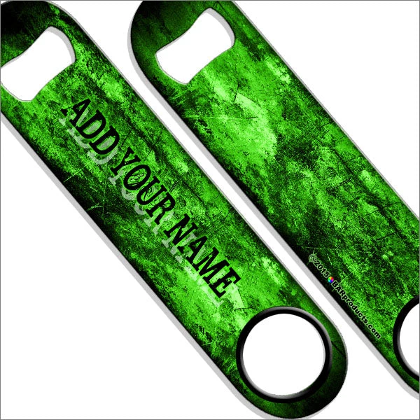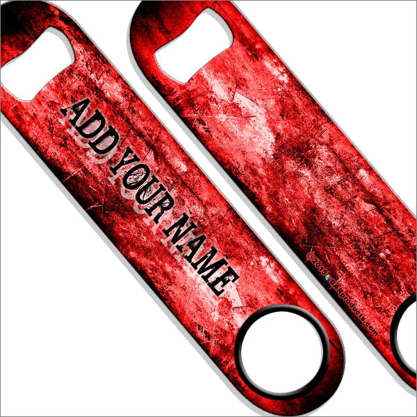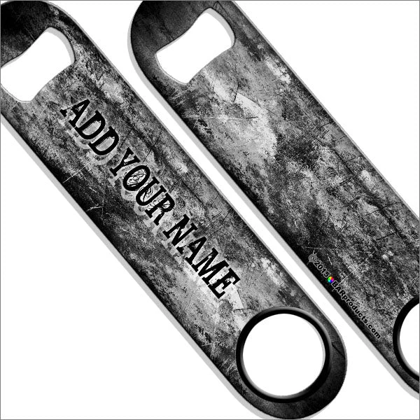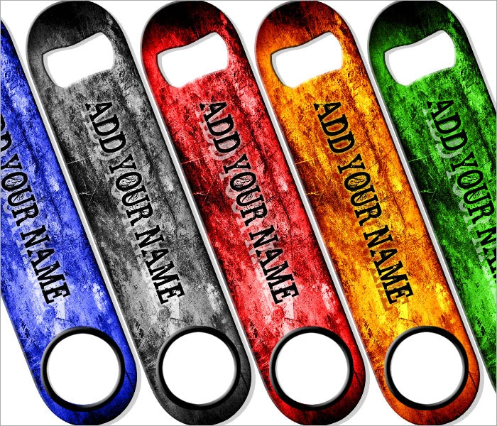 Choose from several color options of this cool “Grunge” Bottle Opener design, and also have the ability to add your own text right into the design. Adding your name (or other text) is optional, but a cool way to claim your opener. Simply choose your color and type in your message. This is also a great customizable gift idea for the bartenders or beer drinkers you wish to show your appreciation for.