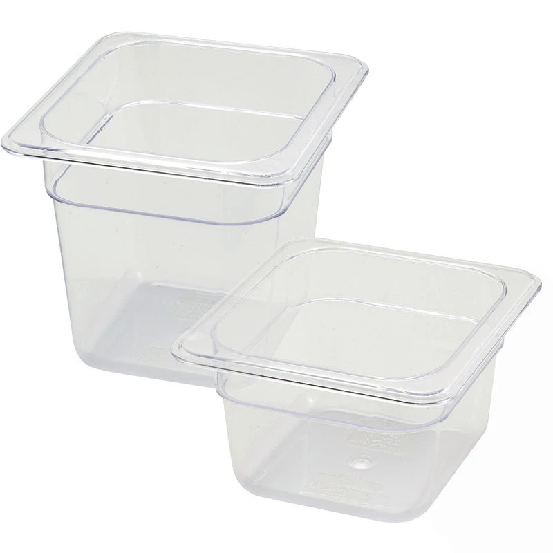 These easy to use, stackable1/6 Size Clear Polycarbonate Food Pans are handy for organizing in any kitchen commercial or residential. They are decided to withstand temperatures from -40°F to 210°F, making them NSF certified, dishwasher safe and crack-resistant for those unforeseen mishaps. Poly-Ware minimizes acidic reaction making it ideal for breads, meats, poultry, fruits and vegetables. The clear PolyCarbonate plastic construction is highly durable and great for transporting, storing and serving raw or already prepped foods. Poly-Ware food pans are ideal while traveling to cater special events or on the go meals with friends and family. Guaranteed to arrive without mess, you can expect to serve you well organized and prepped food directly to a waiting hungry crowd of people. These pans come in many various sizes making it easier to coordinate and pack more efficiently.