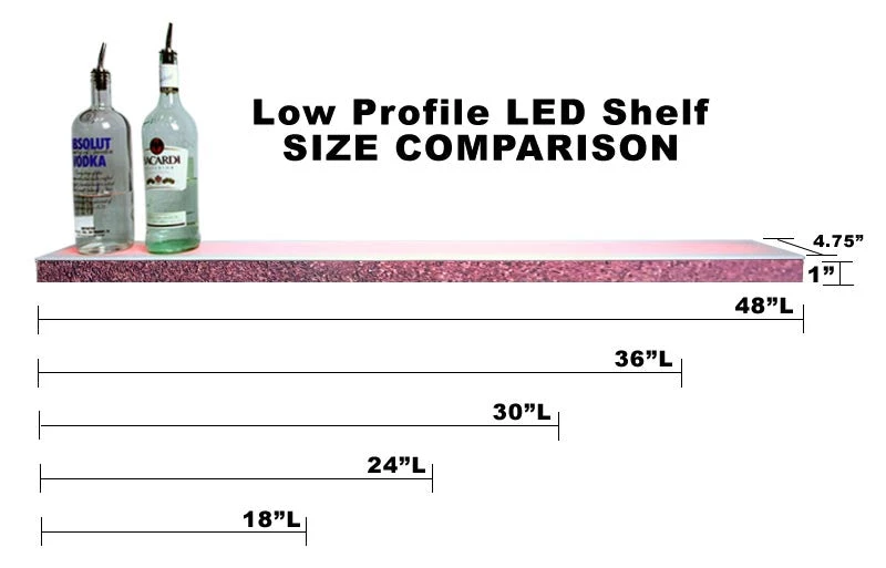 LED Liquor Bottle Display Shelves are a great way to showcase your different types of liquor brands. It grabs the attention of your guests while creating a fun ambiance decor to your bar. These low profile 1 step (tier) shelves are manufactured right here in our USA Woodshop. Each shelf showcases a high quality craftsmanship that is durable and built to last at an unbeatable price.
