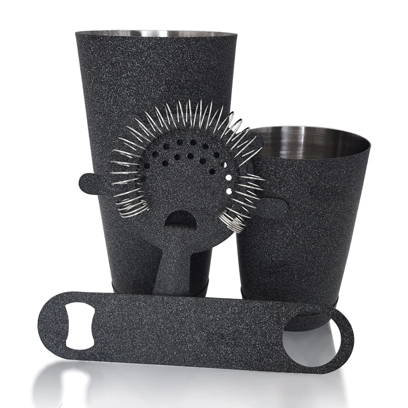 No Bartender’s Kit is complete without these 4 essential items; our 2 weighted shakers, a four prong strainer and a speed opener. Your customers are relying upon you to supply them with the best cocktails you can muster up. It’s a big responsibility, one we know you don’t take lightly. That’s why we’ve assembled this great set of all the must-have tools for every serious bartender out there. When paired, the 28oz. and 16oz. weighted shakers pack a powerful punch when it comes to mixing together cocktail ingredients. The 4 prong strainer is great at control and stability, even in the most fast paced environments. This stainless steel strainer is great at preventing anything but the cocktail from escaping. A key element in this cocktail set is this premium quality speed bottle opener. Slender and long, the speed opener can covertly fit in any back pocket, so it’s always close by when needed. The weathered iron look of this bartending set is the perfect way to add some class and style to any environment. The stylish battered finish has a tough and resilient vibe that makes this cocktail kit perfect for any club or bar.