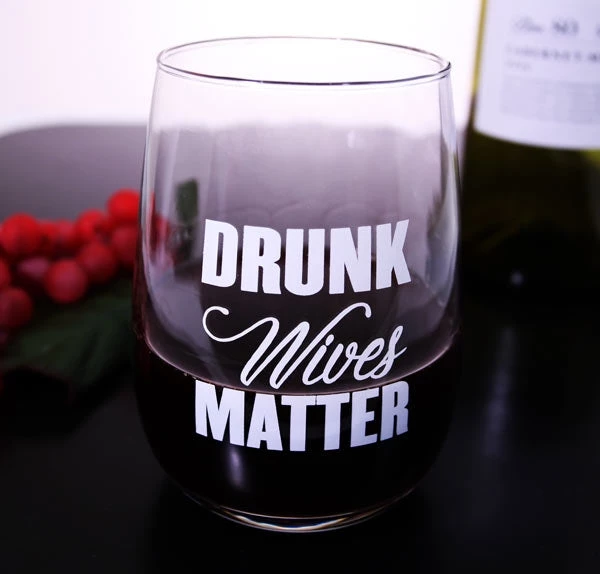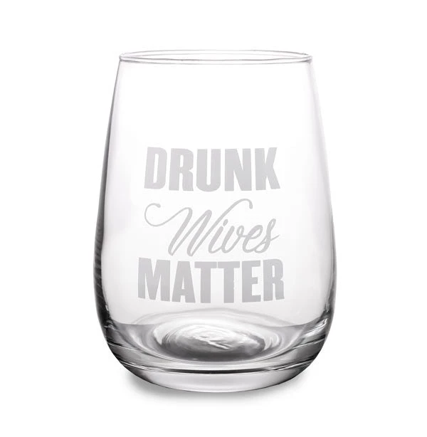 Drunk Wives Matter! Support the cause and have a drink or two out of this popular stemless wine glass! The shape of this glass makes it great for wine, signature cocktails, or even craft beers.