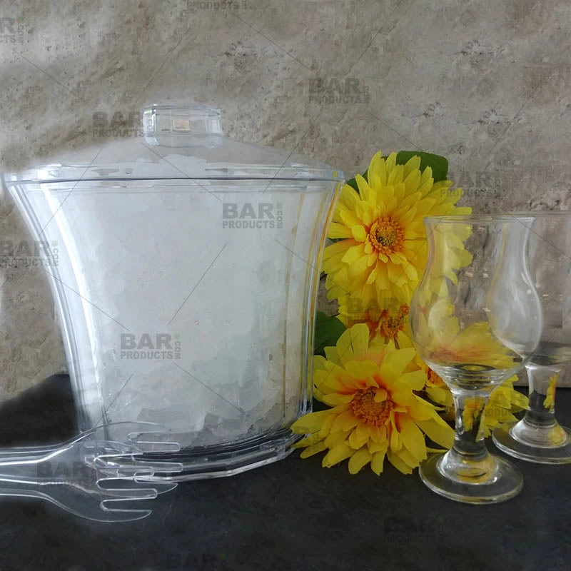This fluted acrylic ice bucket comes with removable liner and tongs. An elegant and modern looking ice bucket will surely impress your guests whether you are hosting a grand party or just a small gathering. A perfect size for any table or counter. This is an attractive acrylic ice bucket made with a solid sturdy design. The inner liner helps with keeping ice from melting and also prevents condensation on your table or counter space. This acrylic 4 qt. ice bucket measures 8″ height x 8 3/4″ rim x 6 1/2″ base. Removable liner measures 7″ height x 8 1/4″ rim x 6″ base with Tongs measuring 7 1/2″ long x 2″ mouth. Ensuring that your ice is sanitary and professional for any occasion.