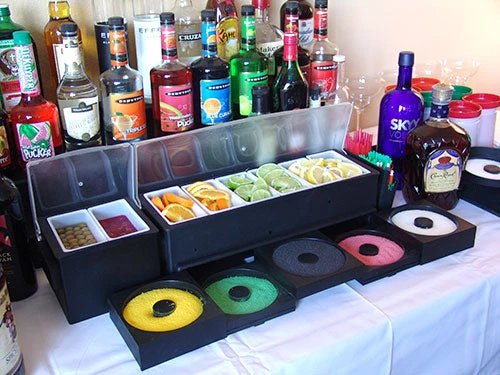 More than meets the eye! The Garnish Center is your all-in-one bar accessory station! It features six garnish compartments and a detachable “side” compartment, and TWO detachable compartments for cocktail accessories such as straws, picks, stirrers, etc. We haven’t even mentioned the best part! Sliding out below is a salt rimmer with not two or three but FIVE tiers for your sugars and salts. You can buy the whole system together or just the components.