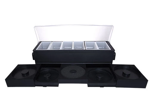 The Main center consists of the 6 compartment garnish inserts and the 5 compartments fold out Salt Rimmers. The Straw compartments (available in left and right side) and side compartment easily latch on the main center. This can be purchased separately or as an entire set.