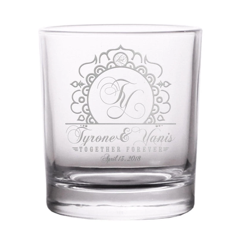 This BarConic® Old Fashioned Glass features a customizable monogram printed on the glass in metallic silver ink. These glasses are the perfect addition to any home and a great way to comemorate your union! Let friends and family know you are in it for the long hall with this elegant Together Forever monogram design. Customize with the names and initials of you and your significant other. Our team of expert designers will take the information you provide and layout it out on this elegant template design. This design is available on our 10oz & 14oz rocks glasses.