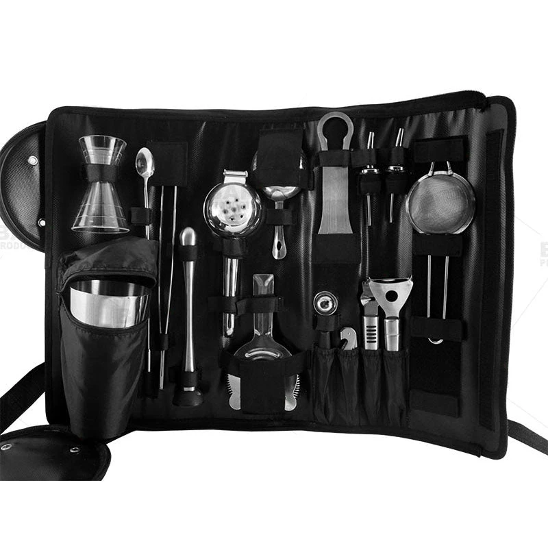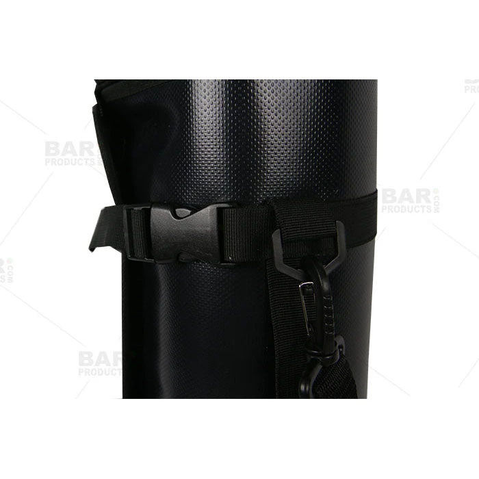 Perfect for the mobile bartender. This Bar Tool Roll is a great way to transport every type of professional bartending tool you need on the go. It is designed to hold 18 common bar tools, and is available with or without the tools. It is a high quality black vinyl material with several Velcro and elastic inserts designed to hold your tools securely in place while traveling. When open, it lays flat displaying your array of tools and then easily rolls up and snaps shut when not in use. The adjustable straps make this bar tool roll ideal for any gender and size to simply sling over their shoulder.
