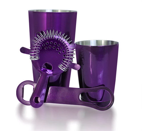 The 4 Piece Candy Purple Package comes with a V-Rod® Opener, a 28 ounce and 18 ounce Weighted Shaker, and a 4 prong strainer. You gotta see these tools shine in your hands! Great for both guys and gals.