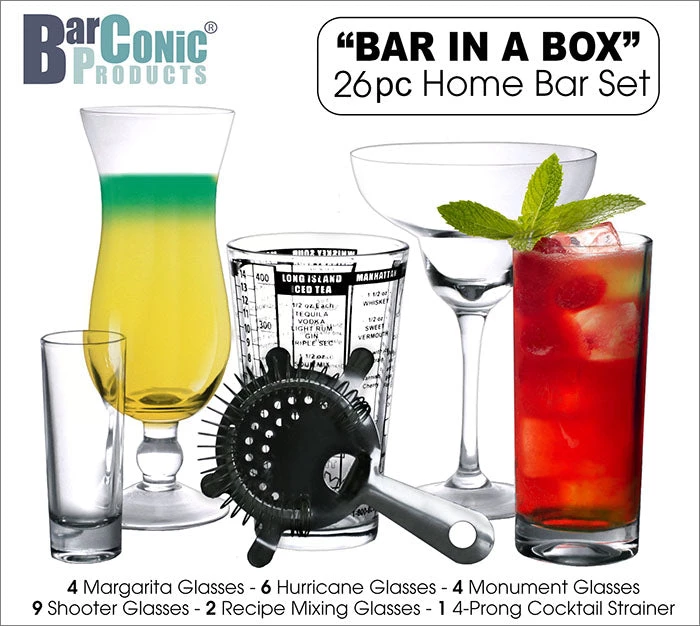 If you are someone who loves to host cocktail hours or Friday game nights and are looking for a great way to stock your home bar or kitchen cabinets with essential barwares, then this custom made BarConic® Bar Set might be just what you are looking for. It includes 26 pieces of essential glassware and tools to make for the perfect cocktail presentation to your guests at an unbeatable price.