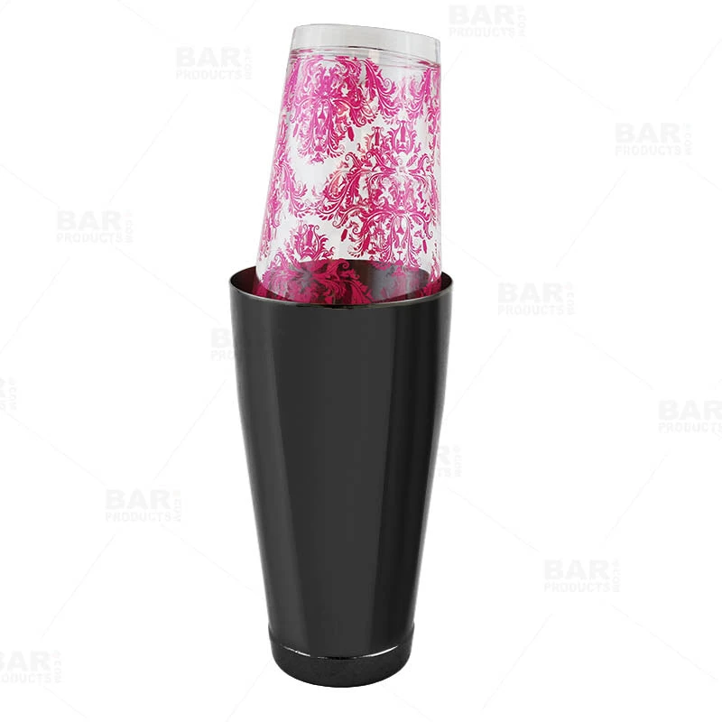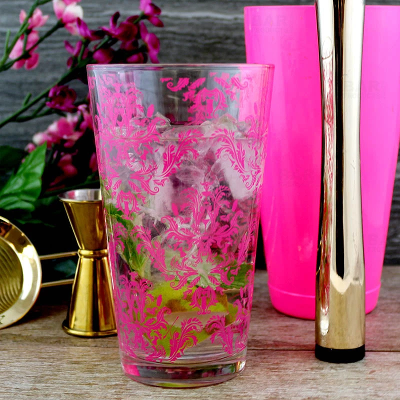 A unique and elegant twist on a classic bartending tool! The mixing glass has been considered a staple in any bar. It is commonly used to cap shaker tins, muddle cocktails and most commonly, stir aromatic spirits. Its many uses has made it a high demand item, and with that we are excited to extend our line of mixing glasses to include this classy pink cocktail themed damask pattern design. You are sure to appreciate the intricate lines of this design, as your liquid libations reflect through the clear glass areas and then are interrupted by the imprinted sections. Pair this mixing glass up with your favorite 28 ounce shaker tin with multiple colors to choose from!