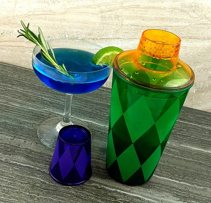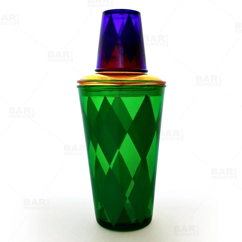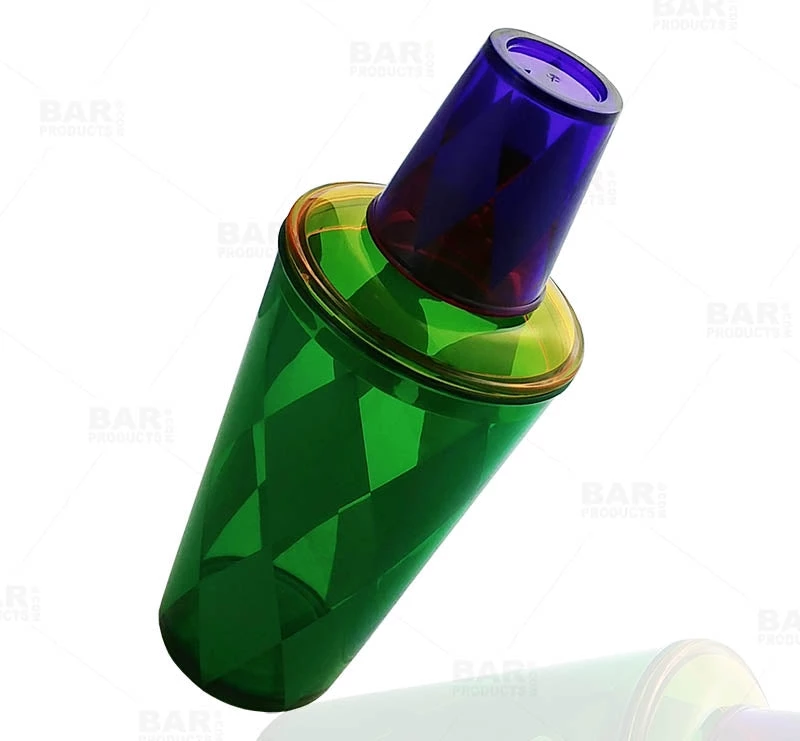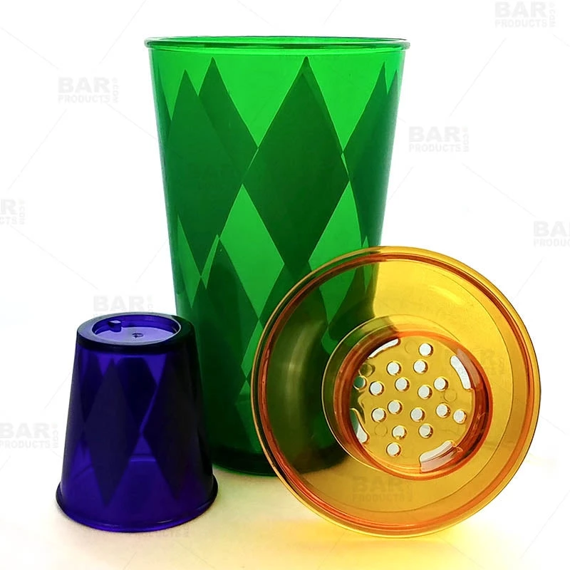 A festive Mardi Gras 3 piece shaker. The fun colors of green, orange, and purple give it the extra stand out look. Made from durable plastic, they are ideal shaker for mixologists or home bar collections. The cup measures 5 1/2″, with all 3 pieces shaker is 8 1/2″ tall. The cap is a measuring cup in itself. This festive Mardi Gras shaker holds 16 oz. and dishwasher safe-top rack only.