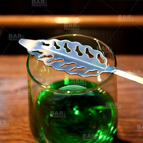 The Absinthe Spoon has played an important role in absinthe drinking since the beginning. Traditionally absinthe is prepared by pouring a single ounce of the absinthe in a glass and placing a perforated spoon over the rim of the glass with a sugar cube set on top. You would then pour ice water slowly over the sugar and let it drip down into the absinthe. This combination of sugar water and absinthe turns the mixture milky white and releases oils that perfume the air with fennel, grand wormwood and anise. Our BarConic® Stainless Steel Absinthe Spoon is the perfect option to accomplish this traditional task as it features a beautiful perforated leaf design as the spoon and is made of stainless steel making for a strong and long lasting product.