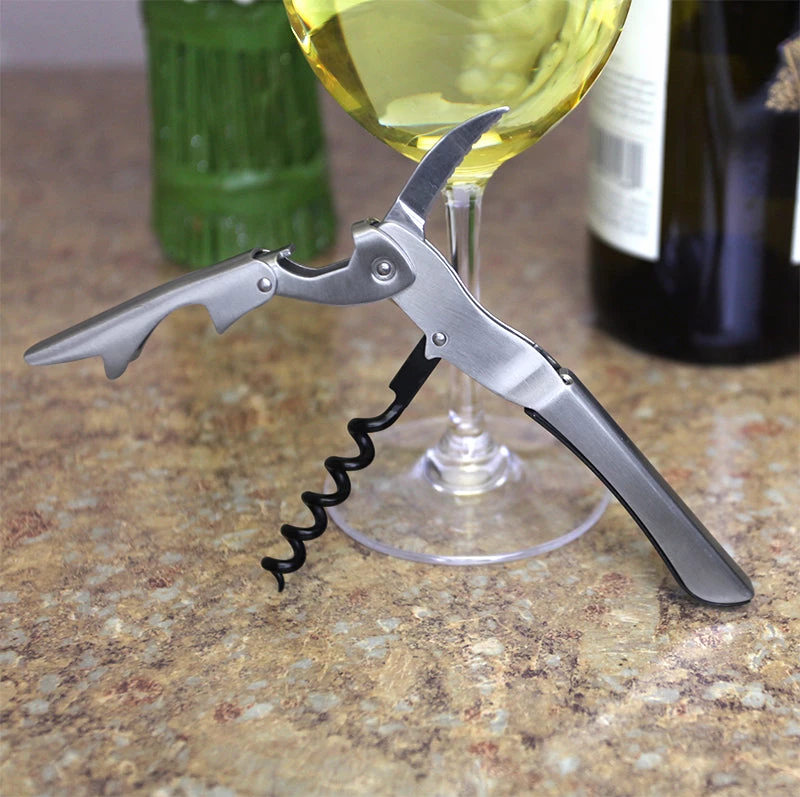 This elegant, professional-quality Stainless Steel Teflon Double Lever Corkscrew features a double-lever boot system which easily removes the cork from the bottle in two easy steps. This wine cork screw is built with top-quality, sleek, brushed stainless steel and a hard plastic undercarriage under the ergonomic grip that also protects the “worm.” The 2.5” long non-stick Teflon-coated spiral inserts easily to corks for fast removal. And, of course, no professional wine opener would be complete without including a serrated foil cutter.