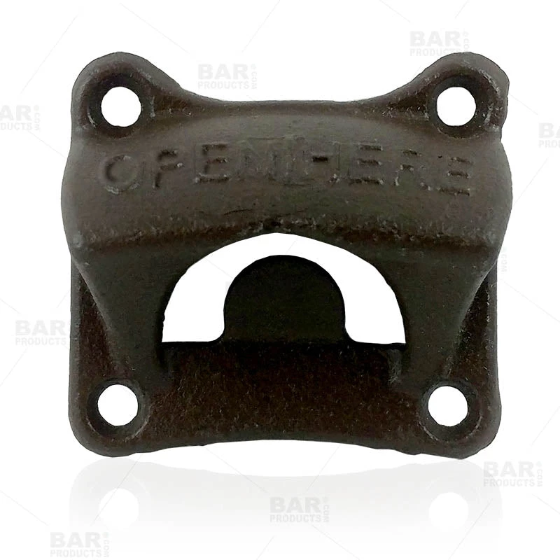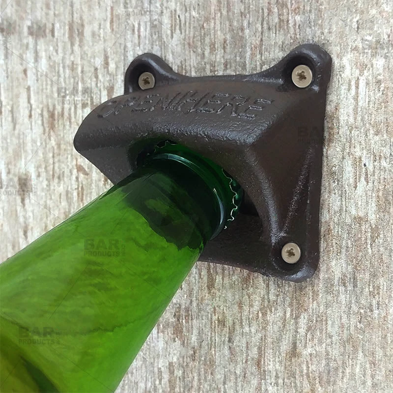 This extremely durable cast iron wall mounted opener showcases a square “open here” message. It easily and securely mounts to your wall or wood plaque with 4 screw holes on the corners, offering you and your guests a unique way to open your beer bottles.
