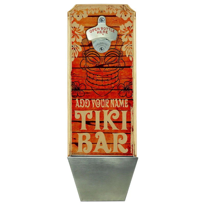Home and bar decor can certainly set the tone for your guests. They can also make for great conversation pieces! This Vintage Style, Tiki Bar themed wall mounted bottle opener and cap catcher will do just that. The best part is that it is completely customizable. All you need to do is simply type in the required fields with your text and we will custom design this very cool, distressed wooden bottle opener for you. Think about how excited your friends and family will be when they receive this gift personalized with their name or favorite phrase.