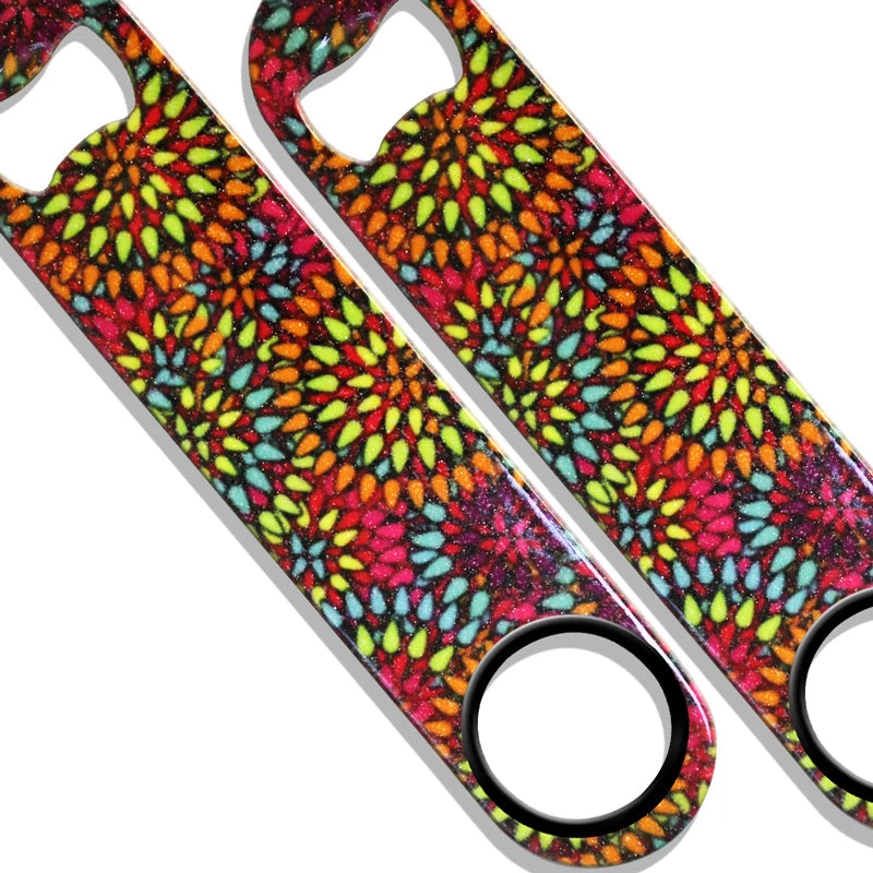 This colorful Glitter Hippie Flowers design is featuring a fun flower pattern that almost looks like fireworks in the night sky. It will surely make a perfect gift for any occasion and makes a great bartending tool for any bartender. The opener itself is made of high quality stainless steel, and is almost impossible to bend or break.