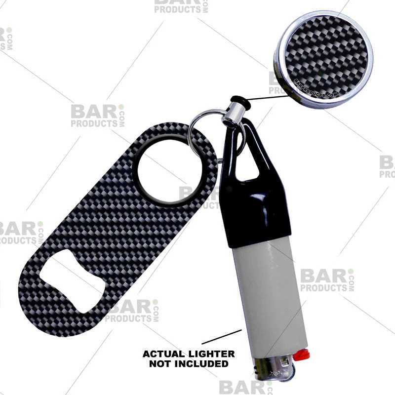 Whether you are a bartender, a smoker or your typical party goer, this retractable reel set is the perfect multi-purpose accessory to your party ammo. The heavy duty chrome reel clips securely onto your pants, pockets and a number of other places you would like to have quick access. The retractable reels expands out to 30 inches, featuring a durable black nylon cord. The chrome face surrounds a high quality vinyl sticker design that matches the Mini Bottle Opener making this set a fun and fashionable statement. The colorful mini opener along with a Lighter Leash Clug are securely fastened to the retractable reel by a nickel plated split ring. Actual BIC lighter is not included with this set.