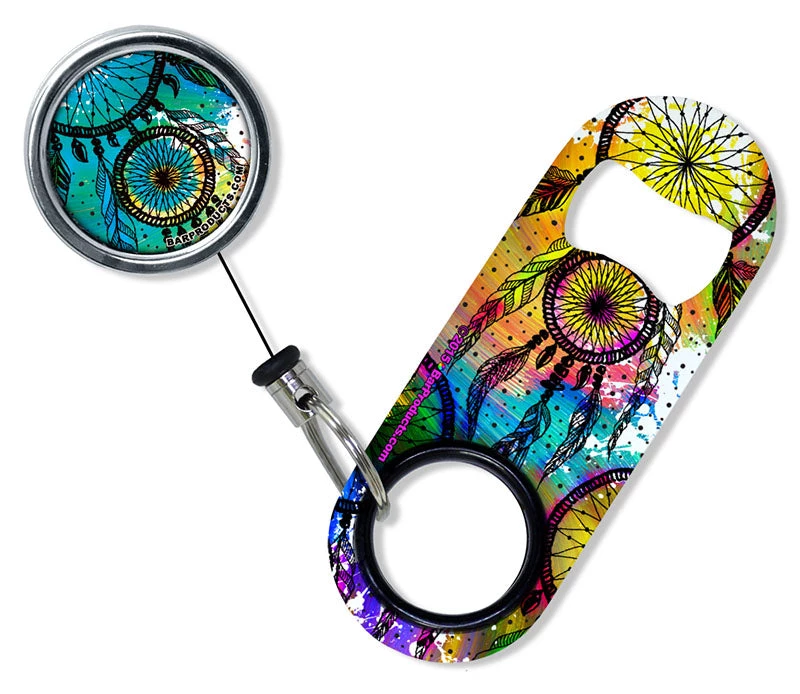 Clip your bottle opener practically anywhere for quick, convenient access… and do it with style! Showcasing a full color Painted Dream Catcher design, we have tastefully decorated our trendy mini bottle opener to match this quality retractable reel. Clip it to your belt, pants, pocket, purse or anywhere else you can think it would come in useful. Don’t miss out on the price break when bought as a set, or purchase them separately to mix and match. This retractable reel also works in conjunction with our other bottle opener styles!