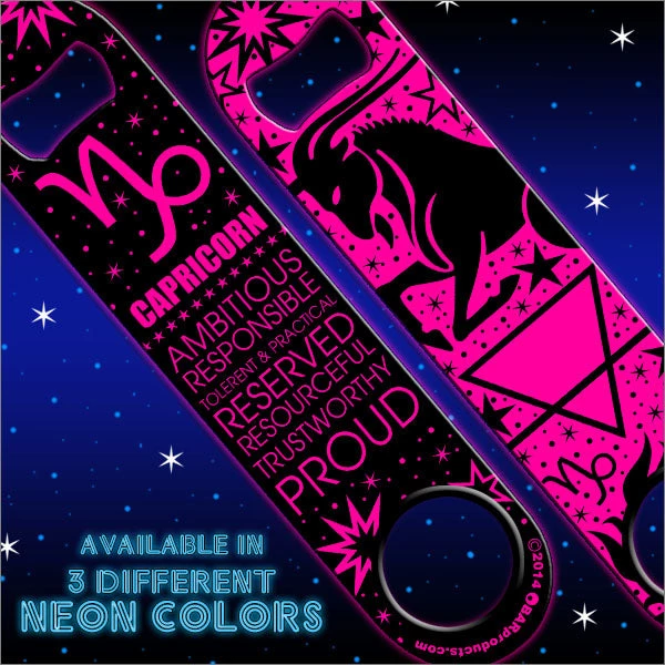 What’s your sign and what does it say about you? We have created a line of NEON Zodiac Sign Speed Bottle Openers you are sure to love. Each of the 12 designs are available on 3 different colored neon openers… Green, Yellow and Pink. They feature all symbols relevant to your astrological birth sign, as well as your characteristics. These bottle openers glow vibrantly under black lighting for the added “space-like” effect.