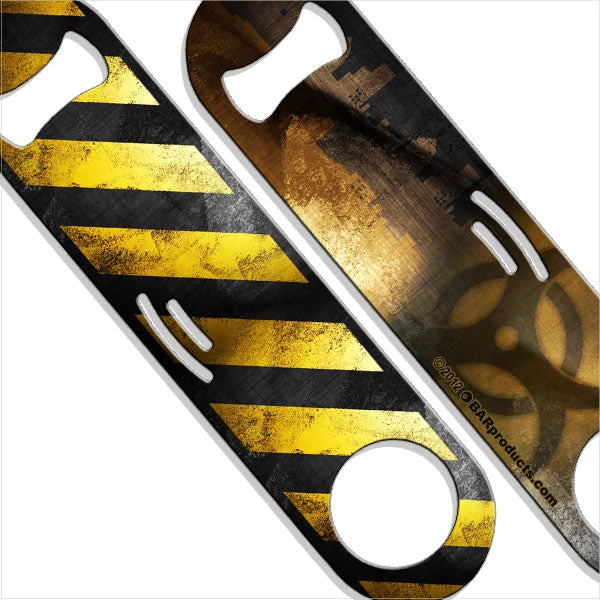 Danger… The end of your beer is near! Stay prepared for “the end” with the Danger StrainBlade® Opener. It has a grunge design with a biohazard symbol that looks to be spray painted over a downtown city in the distance and yellow caution lines that resemble a “do not cross” sign. Are you ready for the end of your beer?