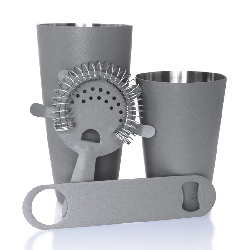 This great bartending set has everything to make sure nothing slows you down behind the bar. All the pieces in this set are made from stainless steel, making them durable and stain resistant. The pairing of the 28 oz. and 18oz. shakers gives the ingredients of the cocktail the right amount of space needed to move around and aerate. The shadow grey textured finish on the shakers allows better grip to prevent them from slipping out of your hands while you’re shaking them. The tight coils of the 4 pronged strainer are perfect at preventing anything but the beverage from being dispensed. The double sided bottle opener was specifically designed to enhance the speed and ease of use to make sure nothing slows you down on a busy night. It’s shaped to sit comfortably in your hand and fits perfectly in your back pocket. The shadow grey textured finish also gives this set a high class sophisticated appeal. This is a great cocktail kit that is an essential purchase for every bar, nightclub and home bar.