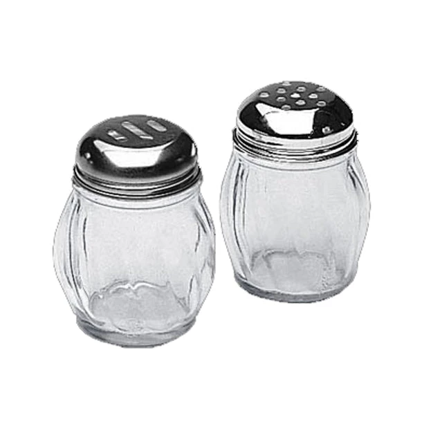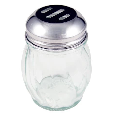 6 ounce swirled glass shaker is great for your grated cheeses. Perfect for spices and red pepper, too! Available with perforated or slotted metal tops.