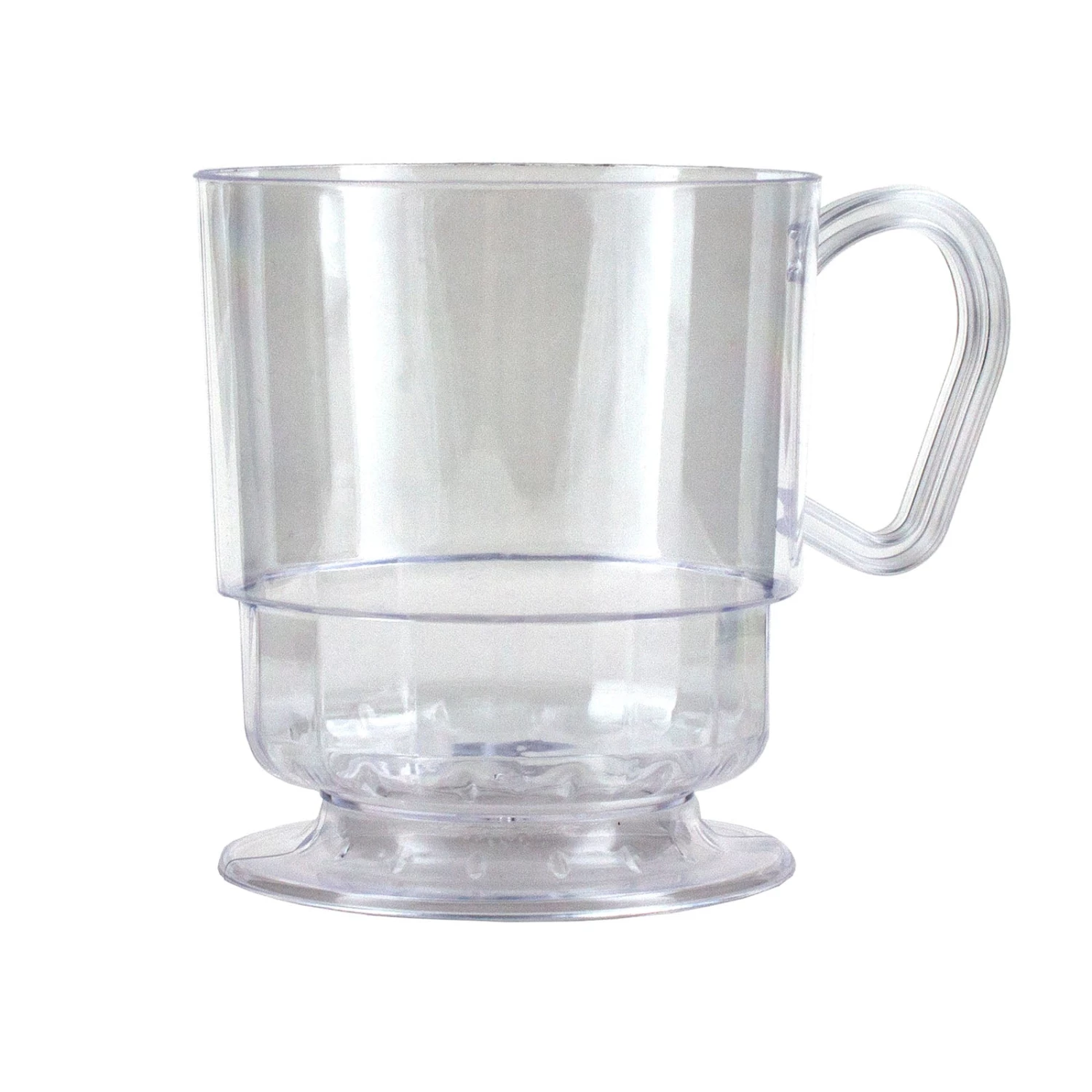 These disposable clear plastic coffee cups are perfect for serving coffee, tea, hot chocolate, and other hot beverages for any party or gathering. These cups include a footed base and flat facets to coordinate with other various Deluxe & Elegance plates, bowls & tumblers. Each pack contains 10 plastic cups that measure 3.35″ tall and have a rim diameter of 2.95″