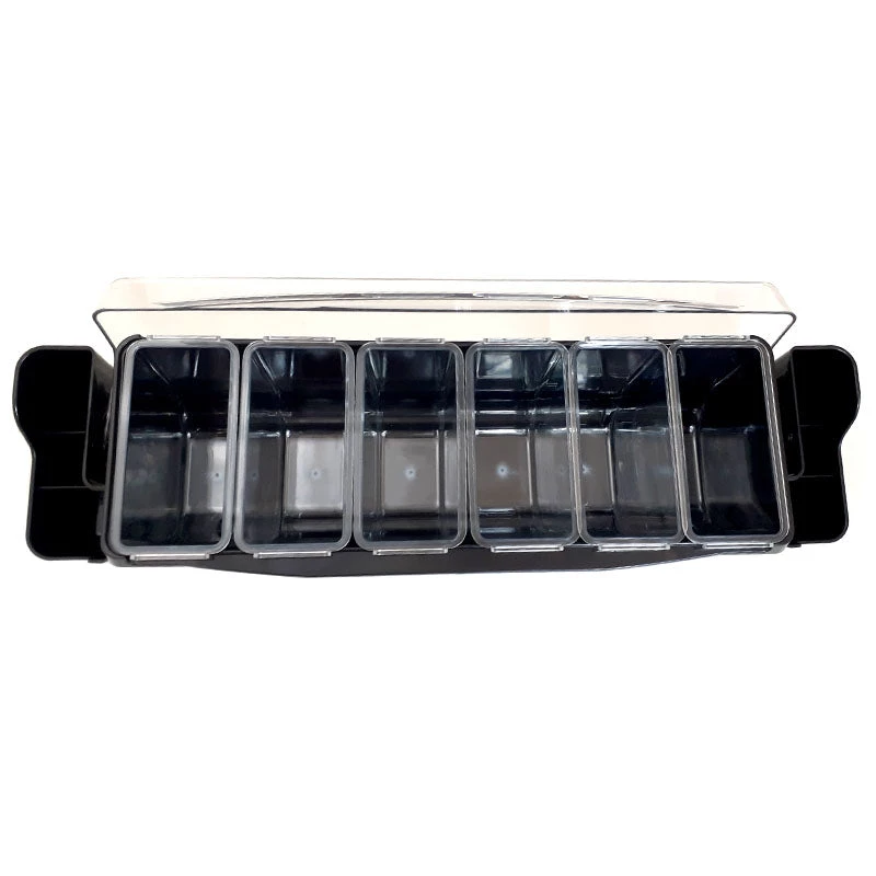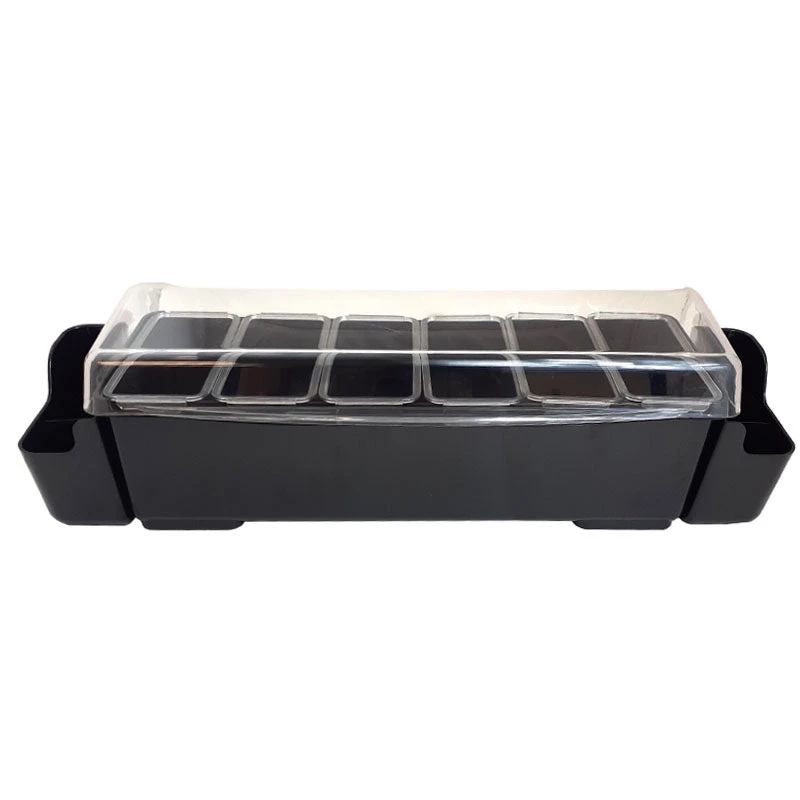 Black plastic bar condiment holder comes with six (1-Quart), hard plastic inserts and has a clear dome shaped lid to see what you need to grab with only a simple glance. The removable inserts allow you to customize your condiment holder to accommodate different garnishes for faster service to your customers. Having the lid can be very useful when storing your garnishes in a fridge or cooler at the end of the night. On each side are straw holders for faster service as well, everything to finish your cocktail in one place. Easy to use and keep clean. Measures 22″ L x 7″ H.