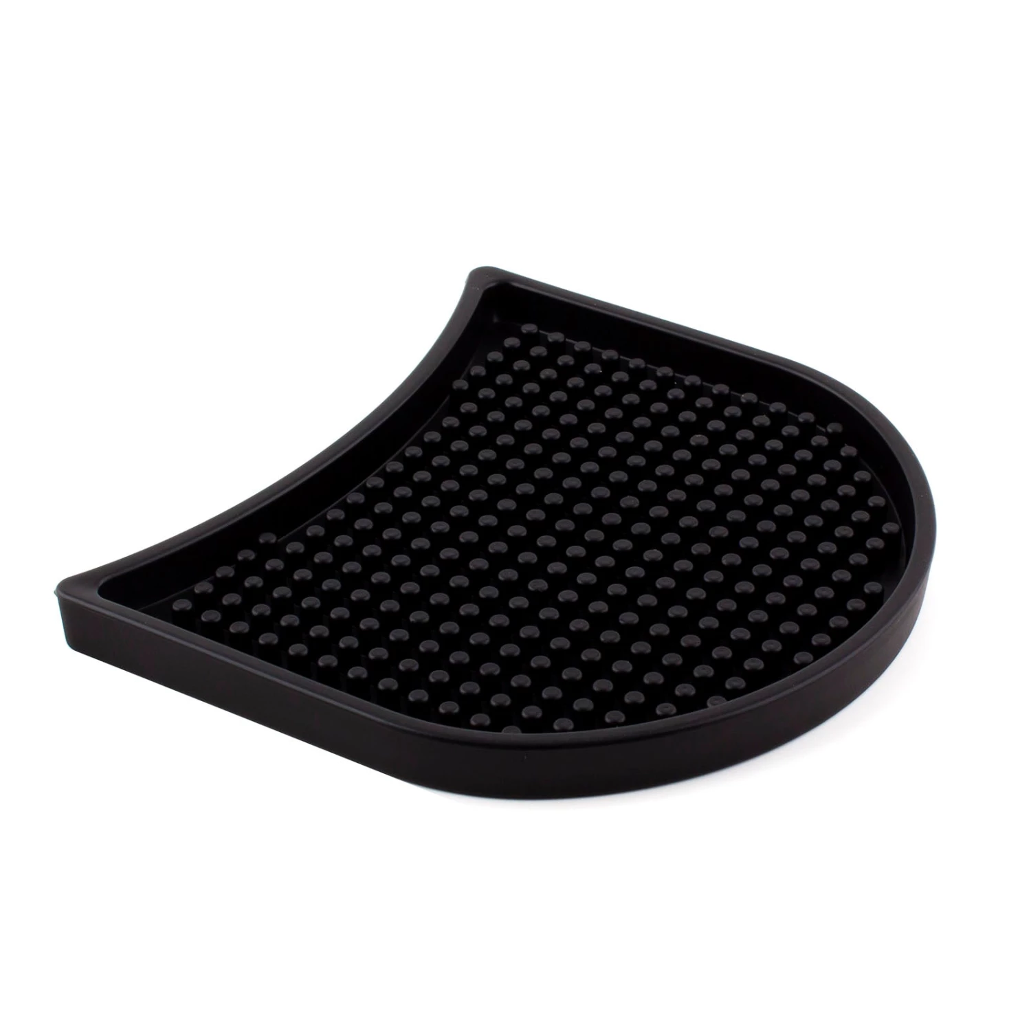 This handy crescent shaped drip mat is a necessity for your next event. The mat provides protection by catching any condensation that comes from a beverage dispenser which helps keep countertops and tabletops free from water rings This drip mat is great for self-serve use at parties and events, as it will provide your guests with a clean and appealing dining experience. It features a lattice base pattern to keep your serving container securely in place. It’s also very easy to clean out when it fills with liquid. This rubber mat is dishwasher safe.