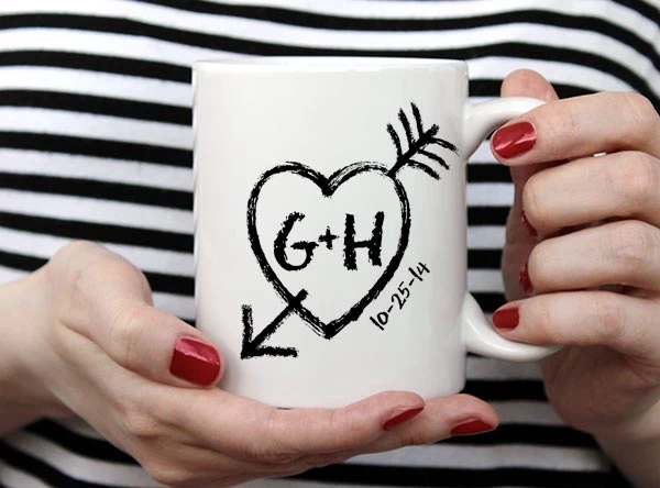 Celebrate the one special person in your life with this 15 ounce coffee mug that features a fun heart and arrow design that allows you to add your own initials and whatever date you’d like. This is the perfect gift for the coffee-lover in your life! Same design on both sides of the mug.