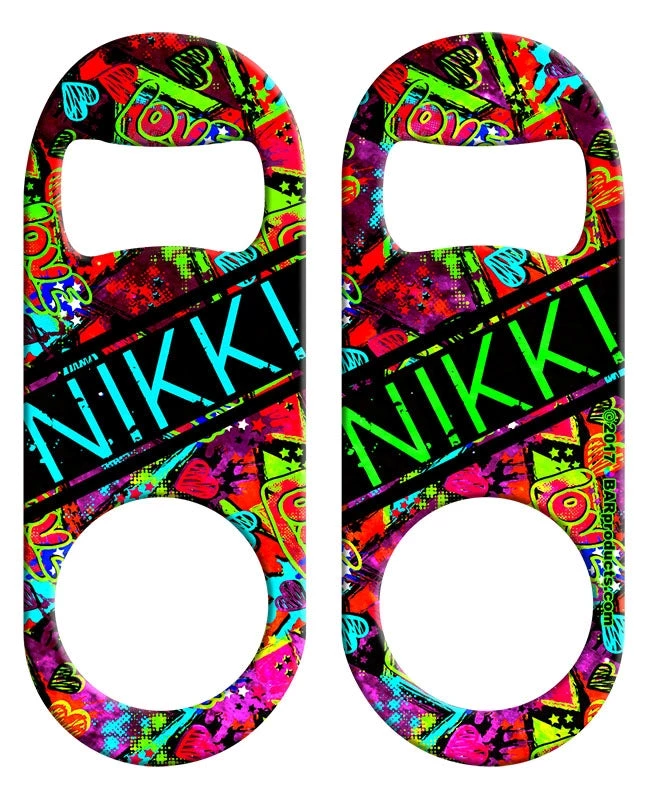 If you are someone that is a fan of our mini style speed openers then you are sure to love the fact that you can now customize them with your very own name! Choose from a selection of fun colorful design templates, such as this “Grungy Love” and simply type in your text… our design team will do the rest!