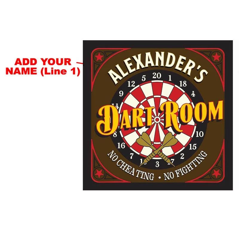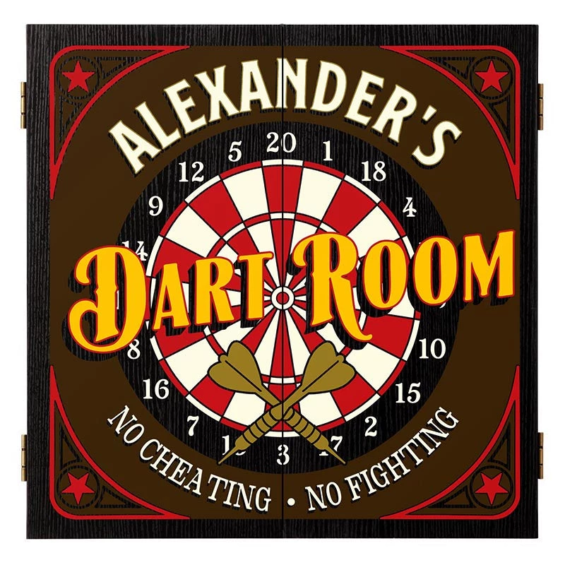 Customizable dart board and cabinet set with “No Cheating” design. The magnetic door lock will keep the doors from swinging out and obstructing your rooms, while printed directly onto the doors are scoreboards for both Darts and Cricket. The hinges of the door feature an antique brass finish to complete the classic look of this cabinet. Underneath the main dartboard area are slots to hold up to six darts upright, to avoid folding the flights, and chalk for the scoreboard. The dartboard is two sided, on one side you can play a traditional game of darts, like 301 or cricket variations. On the other, there is an exciting alternative in baseball darts. Customize with any text you like, just type in what you want and we will do the rest. Easy to Use Mounting Hardware for Quick Installation.