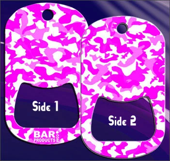 The busy pink and white pattern on this Dog Tag beer bottle opener is a cute way for surfer girls, outdoor adventurers, and party babes to rock a fashionable way to keep the party going. Makes a great gift and comes complete with a metal beaded chain for neck wear.