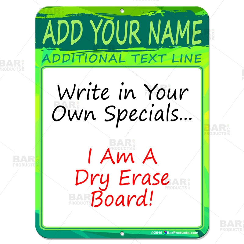 Every bar or restaurant has specials and events they need to promote… it’s what keeps you one step above the competition. There are many ways to get the word out, and this dry erase metal sign is one of the best! This metal “specials” sign is a dry erase board, so you can easily change your specials from day to day or week to week. It wipes away clean with no colored stain left behind. There are 2 small drill holes on the top and bottom, so mounting this sign securely to a wall is easy. Choose from 2 sizes: 12″ x 18″ or 9″ x 12″