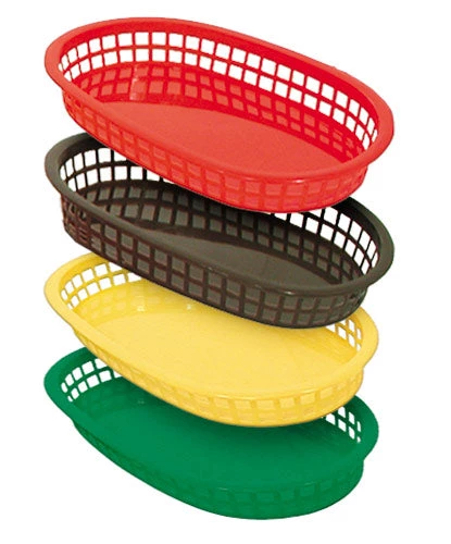 These platter baskets are perfect for diner and fast food establishments. Microwave and dishwasher safe, the come in four color choices and sold by the dozen. Great for sandwich and fries combinations and more. Measures 10.5 x 7 inches.
