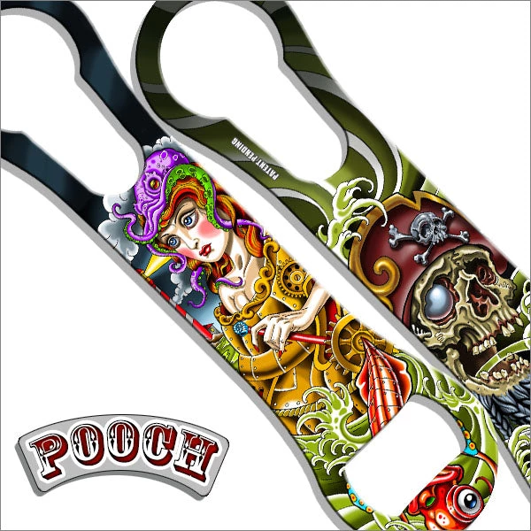 “Nautical Tattoo” is another dark and beautiful tattoo-style design from artist Pooch. Contrasting lines and vivid color accentuate every bit of this bottle opener, showcasing the best of what the Kolorcoat™ process can do! The Patent Pending V-Rod® Bottle opener not only opens Beer Bottles quickly and easily, but it also pulls those stubborn Liquor Pourer Spouts from Liquor Bottles with one simple motion.