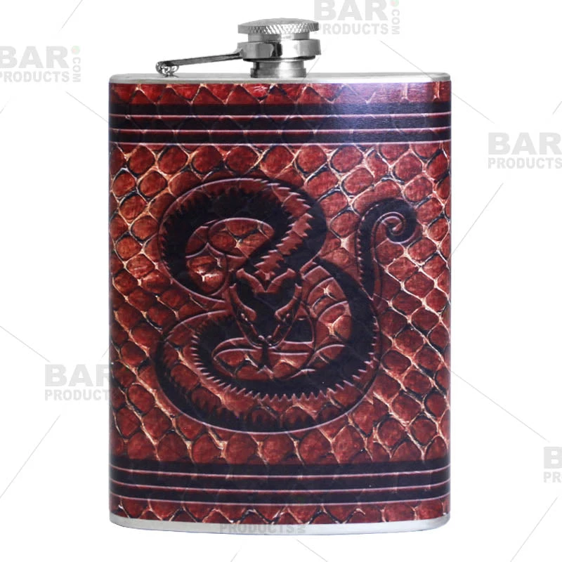 These trendy Hip Flasks not only showcase an extremely high quality, thick food grade (304) stainless steel material, but they also feature a full color design wrap to add a bit more personality to your incognito cocktail. This rustic leather snake design is a great gift idea for the guys.