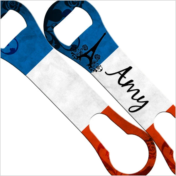 Show your pride or support for France with this beautiful Bar Tool Set that can be customized with your name or text of your choice! This unique set of bar tools is perfect for mixing, shaking, and straining all your favorite cocktails. The V-Rod® is ideal for home or professional bartenders and gives you a convenient way to open up bottles of beer without cutting your hands on bottle caps. You can also use it to remove stubborn pour spouts out of liquor bottles. It is a favorite tool of professional bartenders, and after using it you will surely see why! Customize this set today!