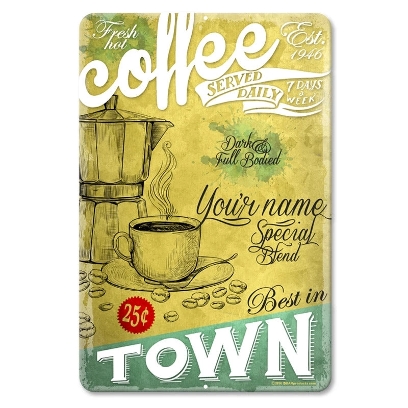 Caffeinate your community with this CUSTOMIZABLE Fresh Hot Coffee 12″x18″ metal cafe sign! It is perfect for showing off your special house coffee blends in a cafe and can also make a great gift for your favorite coffee fanatic! This fun vintage metal sign can be hung at home in your coffee nook or up in a cafe, coffee shop or espresso bar to advertise your special coffee roast blend.