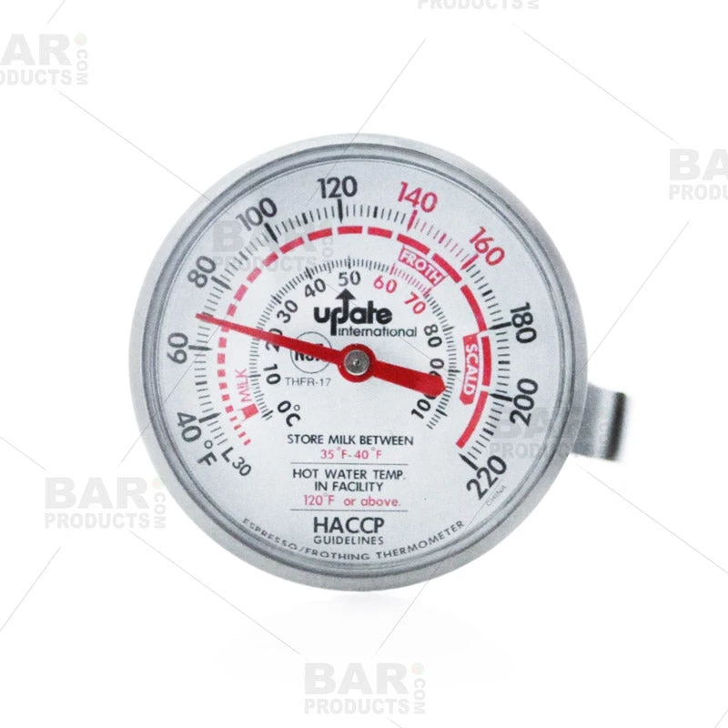 This stainless steel Frothing Thermometer is the perfect tool for measuring the temperature of frothed milk, milk and other liquids. It clearly marks the ideal temperature range for frothing milk and includes an easy to read Fahrenheit and Celsius dial with a temperature range of 30°F – 220°F. This product is made of strong stainless steel and includes handy clip for attaching the thermometer to the sides of sauce pans or other cookware. A barista tool that is perfect for at home or professional use in cafes, espresso bars and so much more!