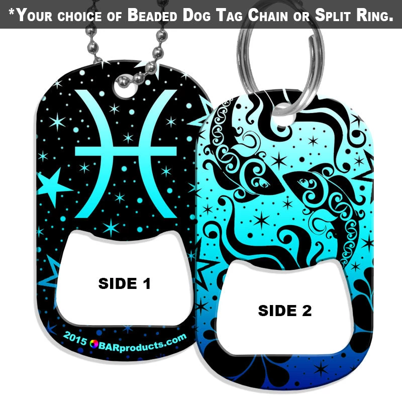 Constructed from a durable stainless steel material, these openers will conquer any bottle cap! The vibrant, full color design wraps the opener on both sides giving it a desirable and seamless look. Choose from many Astrology inspired designs including this Pisces horoscope sign.