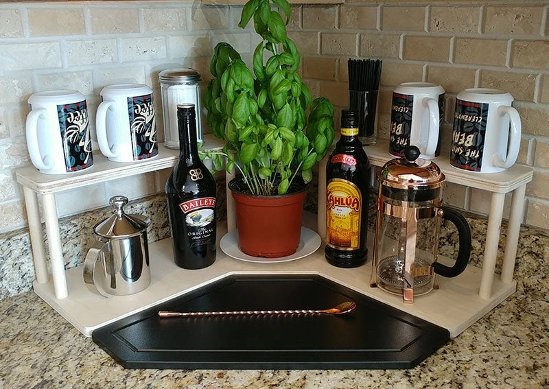 These 2 tier shelves are designed to fit perfectly in the corner, on the counter underneath your cabinets. The 7.5″ tall dowel rods lift the 2nd tier up, allowing the perfect amount of space on the top and bottom tiers to hold your Barista related supplies such as sugars, creamers and other condiments.