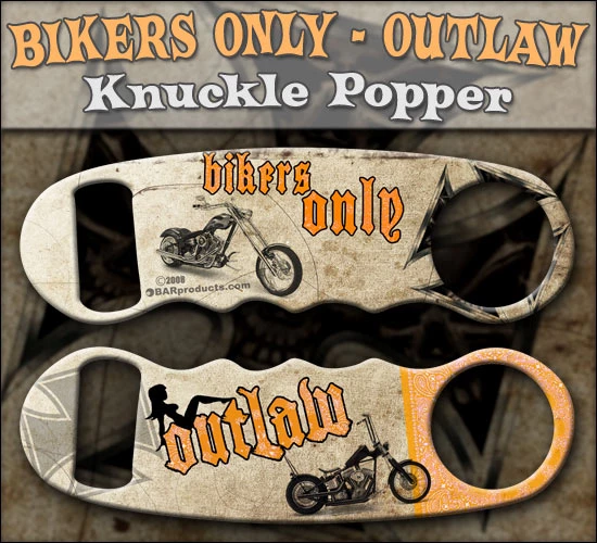 Bikers only! Show your chopper pride with this bike culture designed Knuckle Popper. Grungy and orange, it features a few common biker icons and is made for the kind of bartender who probably doesn’t take attitudes, he gives them.