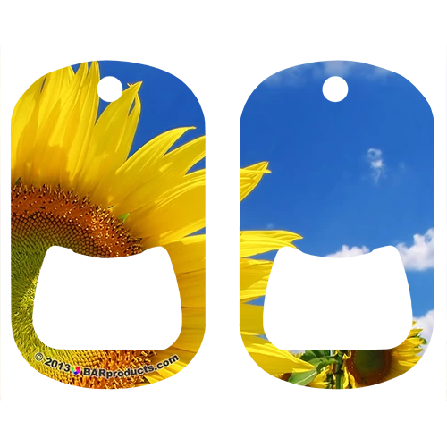With bottle openers we strongly advise that your text stays at least .25 inches from the edges and holes. Some small discoloration can occur near the opener hole during the print process as the metal is indented to accommodate the function of bottle opening.