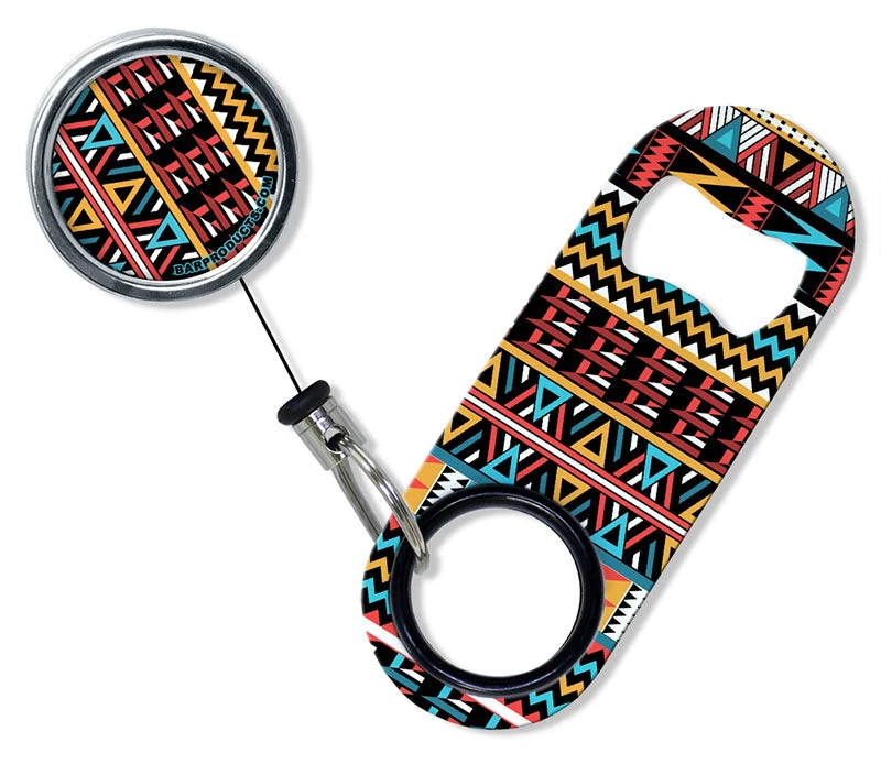 Clip your bottle opener practically anywhere for quick, convenient access… and do it with style! Showcasing a full color Aztec design, we have tastefully decorated our trendy mini bottle opener to match this quality retractable reel. Clip it to your belt, pants, pocket, purse or anywhere else you can think it would come in useful. Don’t miss out on the price break when bought as a set, or purchase them separately to mix and match. This retractable reel also works in conjunction with our other bottle opener styles!